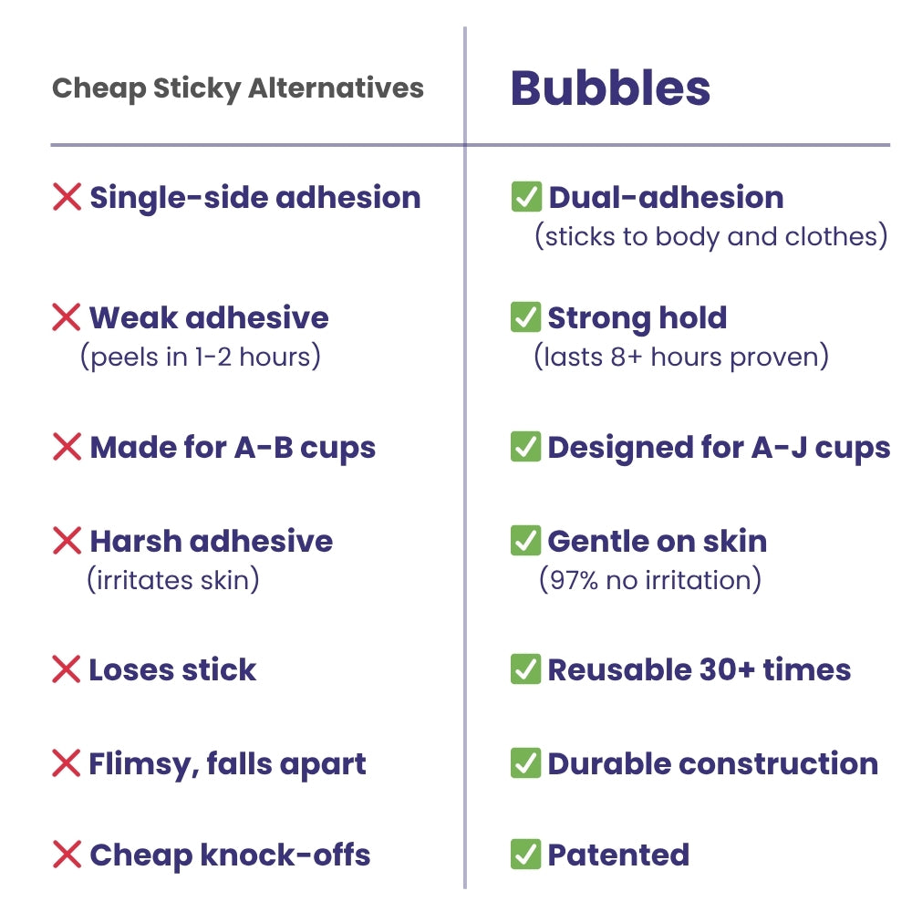 Our patented dual-adhesion technology. Sticks to your clothes AND your skin. The result? They stay exactly where you put them. All day.